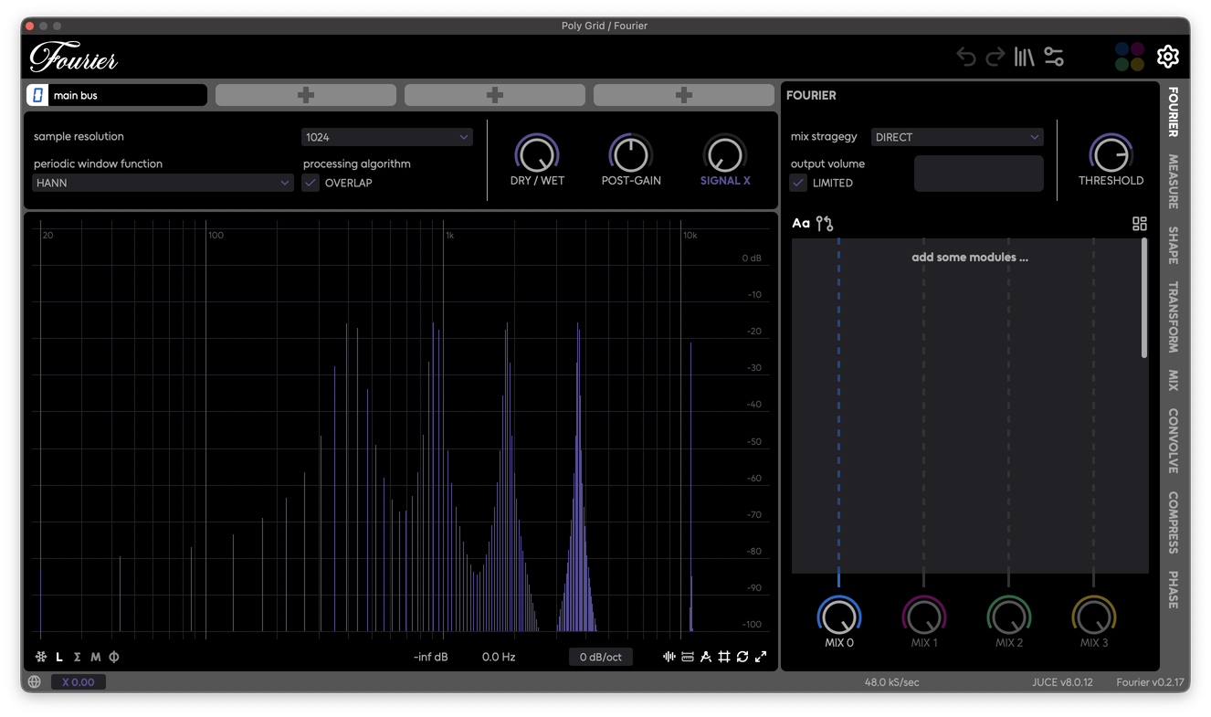 Fourier is a frequency-space VST plug-in effect named after French mathematician and physicist Joseph Fourier. It provides common audio effects such as filtering, compression, modulation, and many more by performing operations on the incoming audio signal solely in the frequency domain. While many audio effects do this under the hood already (such as convolution reverb), Fourier makes these operations explicit and first order.